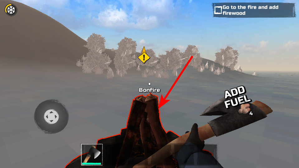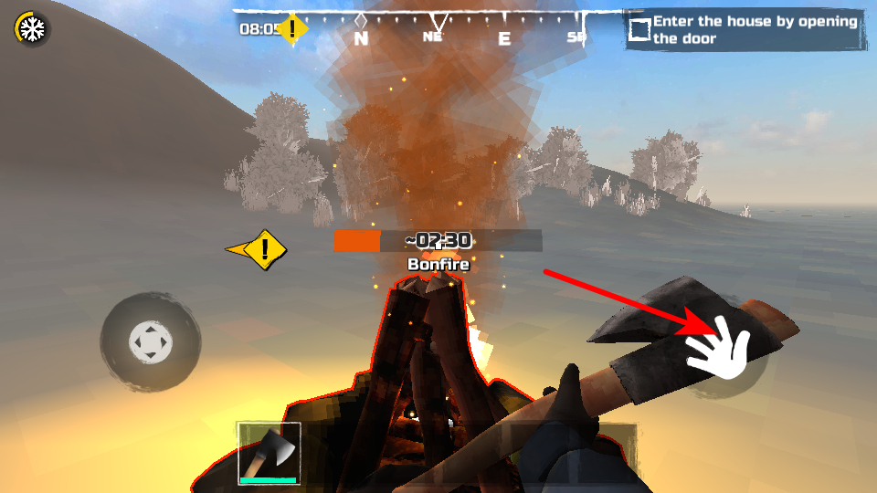 3、點(diǎn)擊交互按鈕點(diǎn)燃篝火,點(diǎn)燃后的篝火能提供溫暖和光源,是在野外生存的重要保障,確保在惡劣環(huán)境中順利存活。