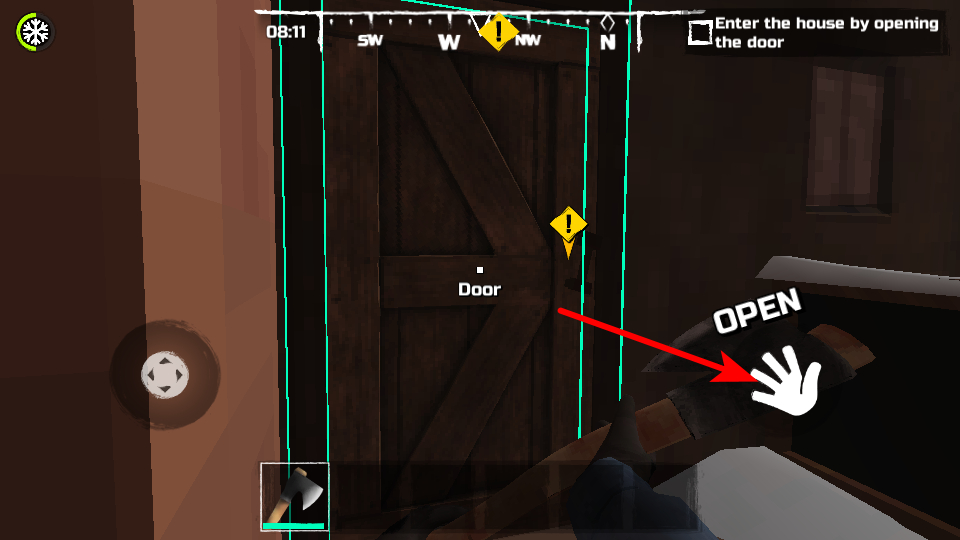 4、靠近房屋大門并點(diǎn)擊OPEN按鈕開門,進(jìn)入房屋可獲取更多資源或躲避危險(xiǎn),是探索和推進(jìn)游戲進(jìn)程的關(guān)鍵步驟。