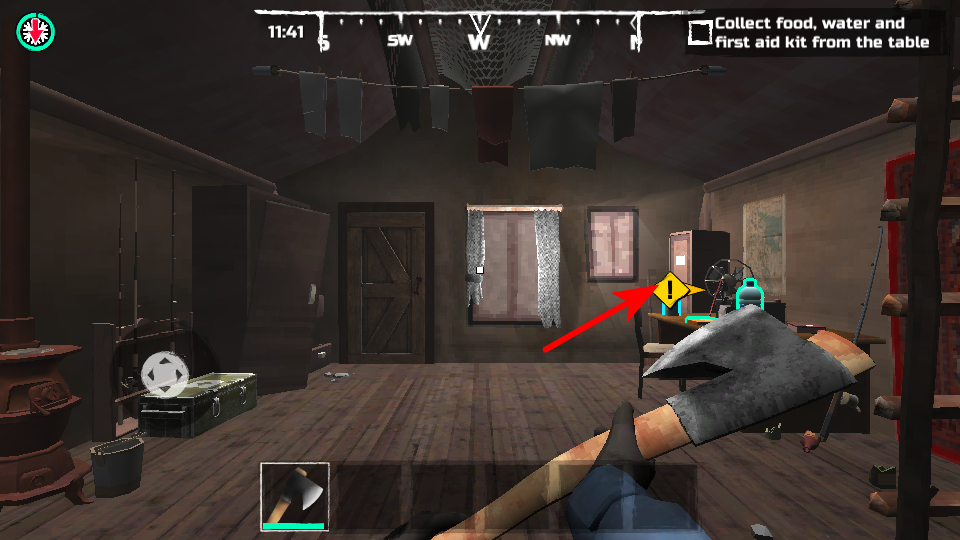 1、在游戲中,靠近屋內(nèi)的桌子區(qū)域,收集食物、水和急救包等生存資源,這些資源是維持角色生命、應(yīng)對(duì)關(guān)鍵保障。