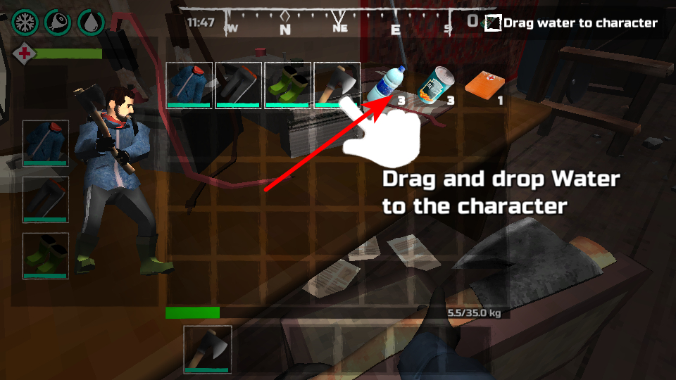 3、在背包中拖拽水到角色身上,及時(shí)補(bǔ)充水分是生存的基礎(chǔ)操作,保持水分充足可避免角色因缺水陷入生存危機(jī)。