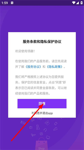 1、在服務(wù)條款和隱私保護協(xié)議彈窗中,點擊同意,進入登錄頁面。