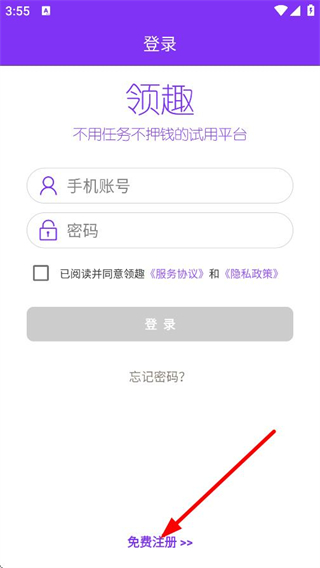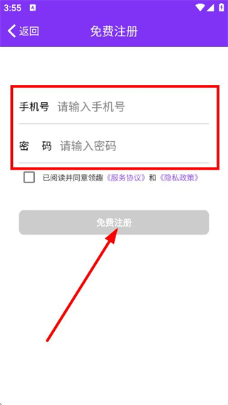 3、在免費注冊頁面,輸入手機號和密碼,點擊免費注冊,完成賬號注冊操作。