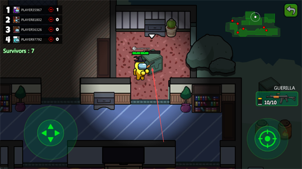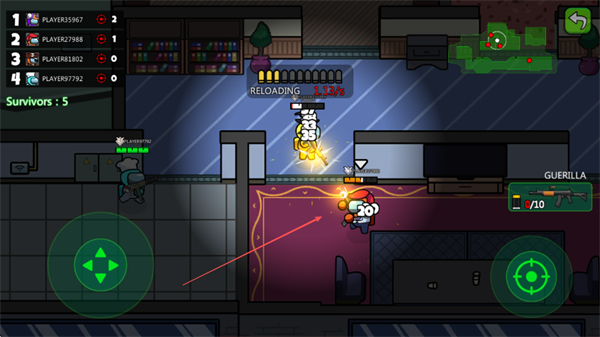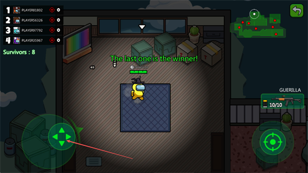 1、用左側(cè)搖桿操控黃色角色移動(dòng),在房間內(nèi)探索,收集武器,目標(biāo)成為最后存活者。