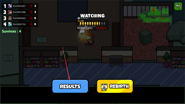 3、使用武器攻擊紅色角色,注意換彈時(shí)間,消滅敵人提升排名,減少存活人數(shù)。