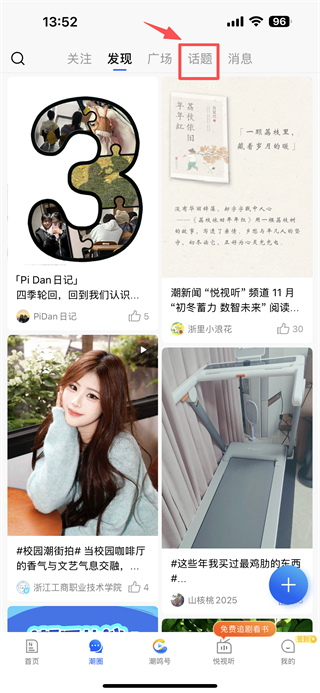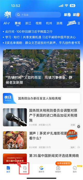 1、打開潮新聞客戶端,點擊底部的潮圈按鈕。