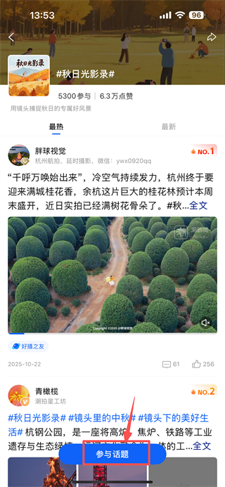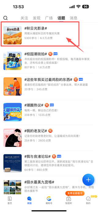 4、在秋日光影錄中點擊底部的參與話題按鈕即可參與活動。