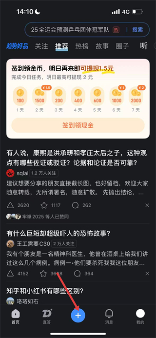 1、在知乎首頁,點擊底部中間的+按鈕,進入創(chuàng)作頁面。