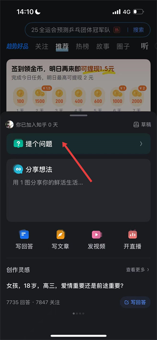 2、在創(chuàng)作頁面,點擊提個問題選項,進入提問頁面。