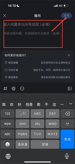 3、在提問頁面,輸入問題內容后點擊發(fā)布按鈕,即可提問。
