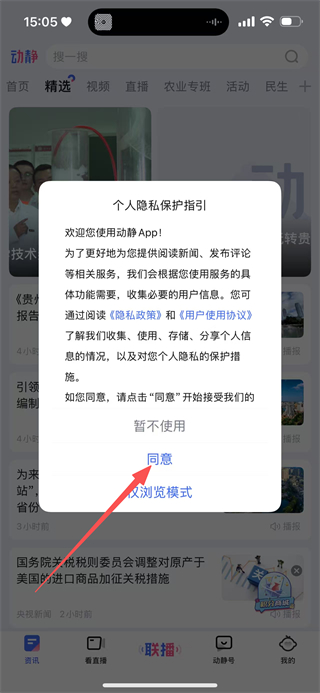 1、在個人隱私保護指引彈窗中,點擊同意,進入首頁。