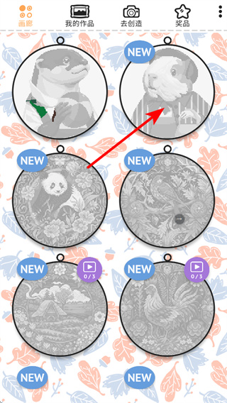 4、選擇新的像素畫(huà)作品開(kāi)始創(chuàng)作,作品選擇是拓展創(chuàng)作內(nèi)容的重要操作,選擇作品可體驗(yàn)多樣的像素畫(huà)創(chuàng)作樂(lè)趣。
