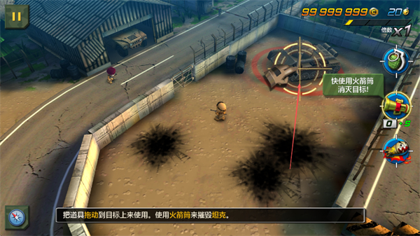 3、拖動火箭筒道具到坦克目標上,使用火箭筒摧毀坦克,完成重型目標消滅任務。