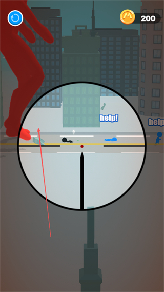 3、通過狙擊鏡精準(zhǔn)瞄準(zhǔn)巨人,避開平民藍色help!標(biāo)識,確保射擊命中巨人。