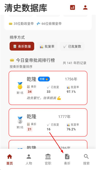 1、在清史數(shù)據(jù)庫(kù)首頁(yè),點(diǎn)擊底部奏折選項(xiàng),進(jìn)入奏折頁(yè)面。