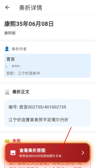 3、在奏折詳情頁(yè)面,點(diǎn)擊查看奏折原圖按鈕,進(jìn)入奏折原圖查看頁(yè)面。