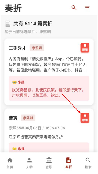 2、在奏折頁(yè)面,選擇感興趣的奏折,點(diǎn)擊原圖按鈕,進(jìn)入奏折詳情頁(yè)面。