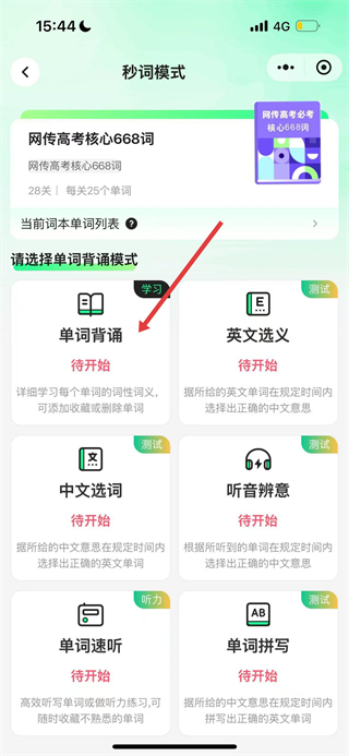 2、在秒詞模式頁(yè)面,選擇單詞背誦模式,進(jìn)入學(xué)習(xí)挑戰(zhàn)頁(yè)面。