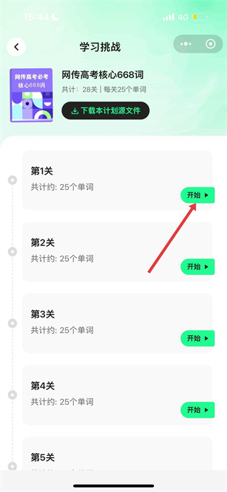 3、在學(xué)習(xí)挑戰(zhàn)頁(yè)面,點(diǎn)擊第1關(guān)的開(kāi)始按鈕,進(jìn)入單詞學(xué)習(xí)頁(yè)面。