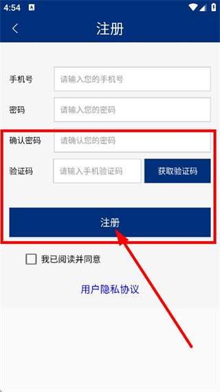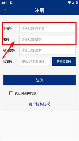 3、隨后我們可以在注冊頁面,輸入手機(jī)號、密碼。