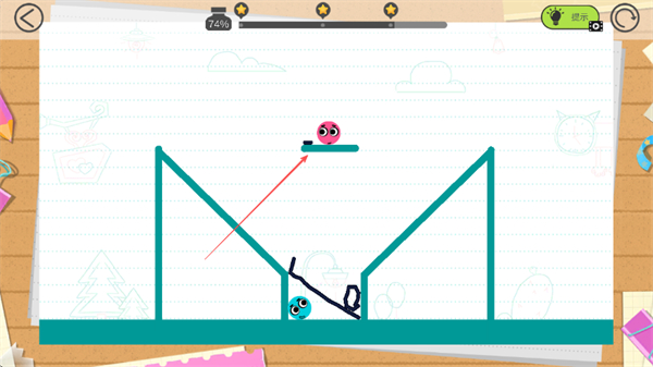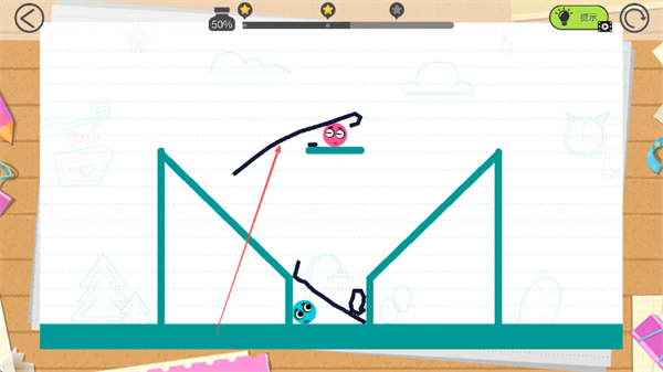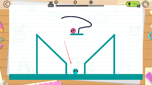 3、通過繪制的線條引導(dǎo)粉色小球下落,與藍(lán)色小球碰撞,完成關(guān)卡目標(biāo)。