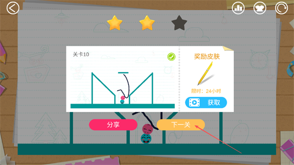 4、通關(guān)后可獲得星星評價,點擊下一關(guān)繼續(xù)挑戰(zhàn),還可獲取獎勵皮膚。