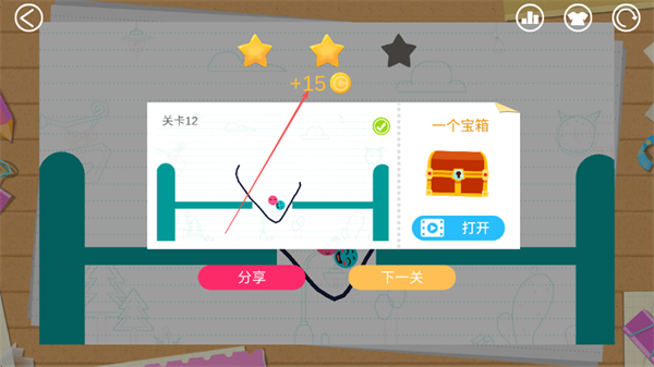 4、通關(guān)后獲得星星評(píng)價(jià)和金幣獎(jiǎng)勵(lì)如+15,點(diǎn)擊下一關(guān)繼續(xù)挑戰(zhàn),還可打開(kāi)寶箱獲取獎(jiǎng)勵(lì)。
