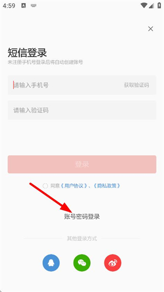 3、在登錄頁面,點擊賬號密碼登錄,切換到賬號登錄頁面。
