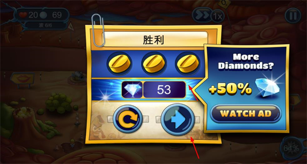 4、成功抵御所有波次敵人后,可獲得金幣、鉆石等獎勵,還可通過觀看廣告獲取更多鉆石。
