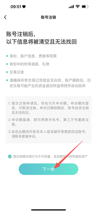 5、在賬號注銷說明頁,勾選且自愿放棄所有虛擬資產(chǎn),點擊下一步。