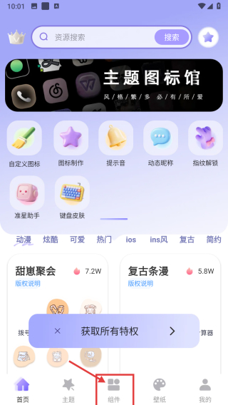 1、打開(kāi)主題美化APP,點(diǎn)擊底部組件選項(xiàng),進(jìn)入桌面小組件專區(qū)。