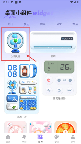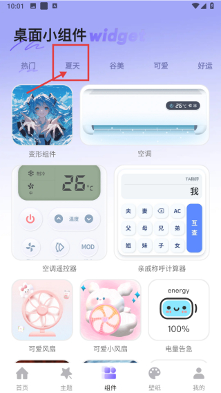 2、在桌面小組件專區(qū),點(diǎn)擊夏天分類標(biāo)簽,篩選出夏日主題組件列表。
