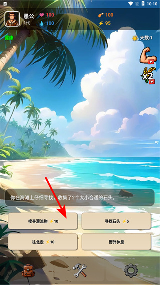 1、在游戲中,選擇尋找石頭等資源收集選項,資源收集是生存發(fā)展的關(guān)鍵操作,收集后可積累石頭基礎(chǔ)材料,用于建筑。