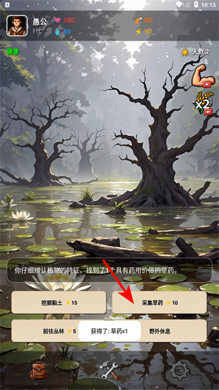 3、選擇采集草藥等生存技能操作,技能執(zhí)行是保障健康的關(guān)鍵環(huán)節(jié),執(zhí)行后可獲取草藥用于恢復(fù)健康,在保持良好狀態(tài)。