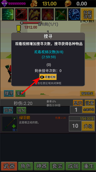 1、在游戲中,點(diǎn)擊觀看視頻獲取搜尋次數(shù),次數(shù)獲取是積累資源的關(guān)鍵操作,獲取后可通過(guò)搜尋獲得各類物品,為升級(jí)提供材料。