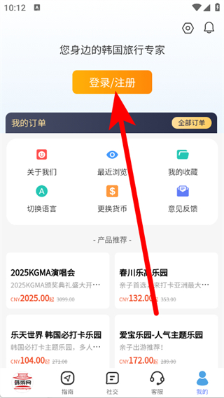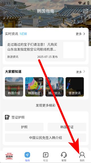 1、打開韓國指南,進(jìn)入主界面后,點(diǎn)擊右下角我的。