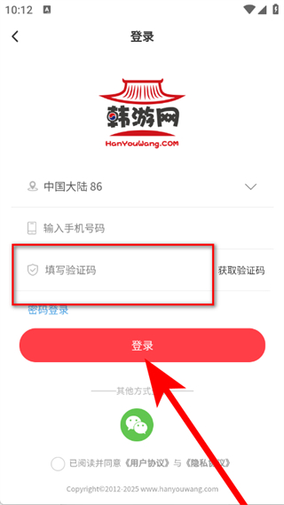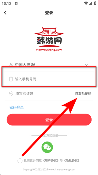 3、在登錄頁面,輸入手機(jī)號(hào)碼后,點(diǎn)擊獲取驗(yàn)證碼。