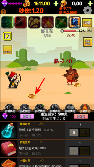 4、拾取場景中的金幣,金幣拾取是資源積累的重要操作,拾取后可補充金幣儲備,為后續(xù)的武器升級、道具購買提供充足資金。