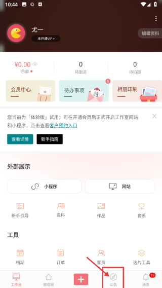 1、打開工作室管理類APP,點擊底部公告選項,進入公告頁面。