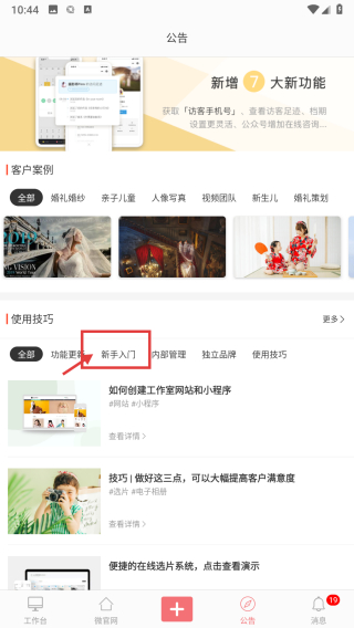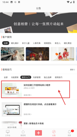 3、在新手入門教程列表中,點擊如何創(chuàng)建工作室網(wǎng)站和小程序教程,進入教程詳情頁。