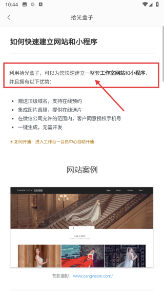 4、在教程詳情頁,查看利用拾光盒子快速建立網(wǎng)站和小程序的優(yōu)勢說明,包括贈送頂級域名、集成圖片直提等功能優(yōu)勢。