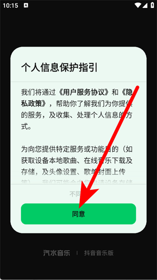 1、打開(kāi)汽水音樂(lè)tv版,在個(gè)人信息保護(hù)指引彈窗中點(diǎn)擊同意。
