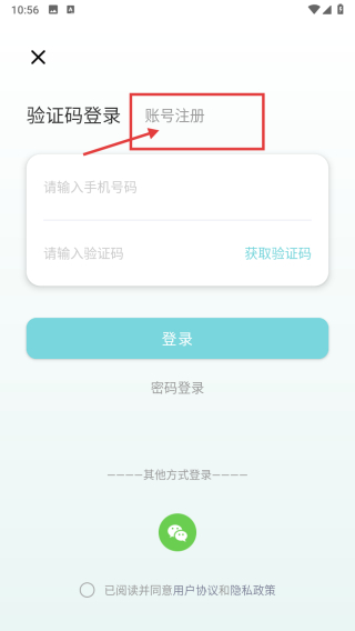 3、在登錄界面,點(diǎn)擊賬號(hào)注冊(cè)選項(xiàng),切換至賬號(hào)注冊(cè)頁(yè)面。