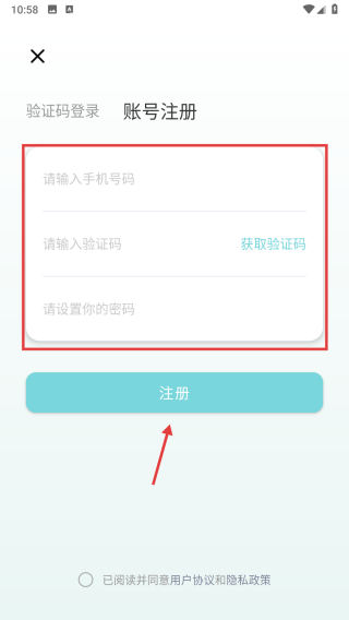 4、在賬號(hào)注冊(cè)頁(yè)面,輸入手機(jī)號(hào)、驗(yàn)證碼并設(shè)置密碼,勾選協(xié)議后點(diǎn)擊注冊(cè)按鈕,完成賬號(hào)注冊(cè)操作。