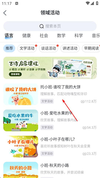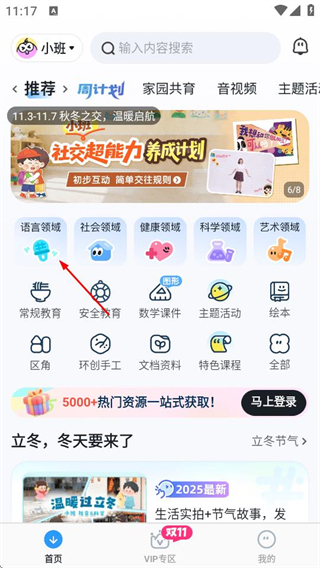 1、在幼師貝殼首頁,點擊語言領(lǐng)域選項,進入領(lǐng)域活動頁面。