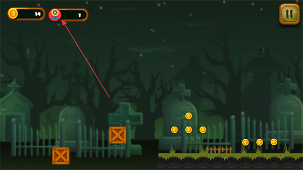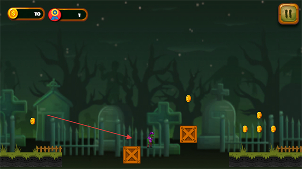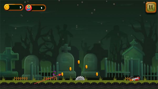 1、操控紫色僵尸在墓地場景中奔跑,收集沿途的金幣,注意躲避鋸齒、陷阱等障礙物。
