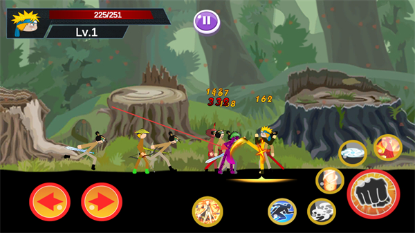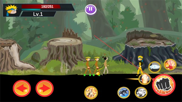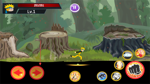1、通過左下角的紅色左右方向鍵控制火柴人角色移動,在森林場景中探索前進。