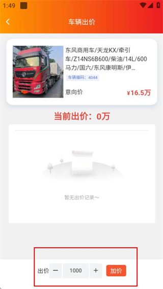 4、在車輛出價(jià)頁(yè)面,可設(shè)置出價(jià)金額后點(diǎn)擊加價(jià),參與車輛競(jìng)價(jià)。