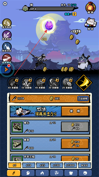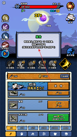 2、點(diǎn)擊紫色妖怪進(jìn)行攻擊,擊敗妖怪可獲得金幣和經(jīng)驗(yàn),用于升級屬性。