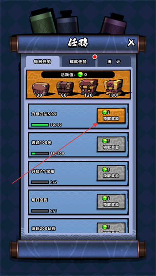 4、完成每日任務(wù)如揮刀萬次50次,點(diǎn)擊“領(lǐng)取獎勵”獲取資源,助力角色成長。