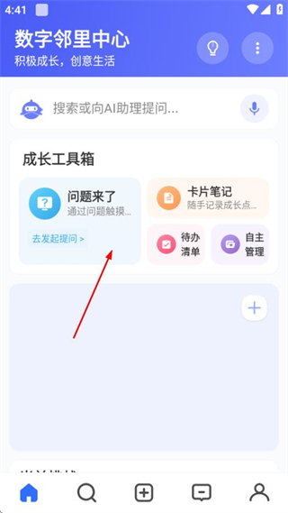 1、在數(shù)字鄰里中心首頁,點擊問題來了選項,進(jìn)入選擇家庭名片頁面。
